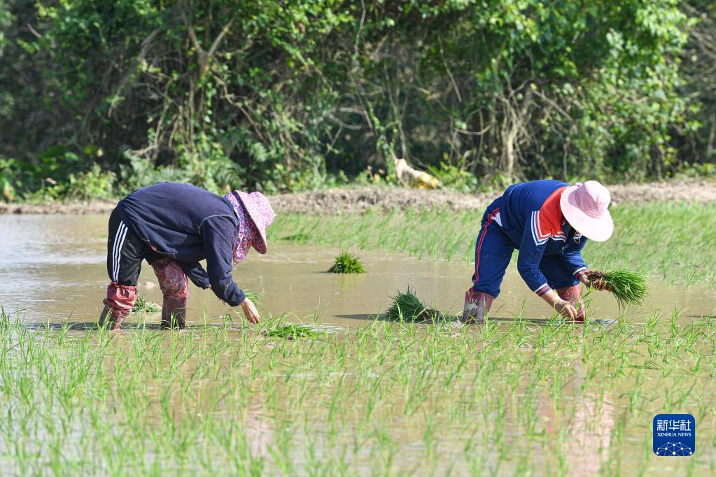 1月30日,農民在海口三十六曲溪省級濕地公園周邊的稻田里種植早稻。