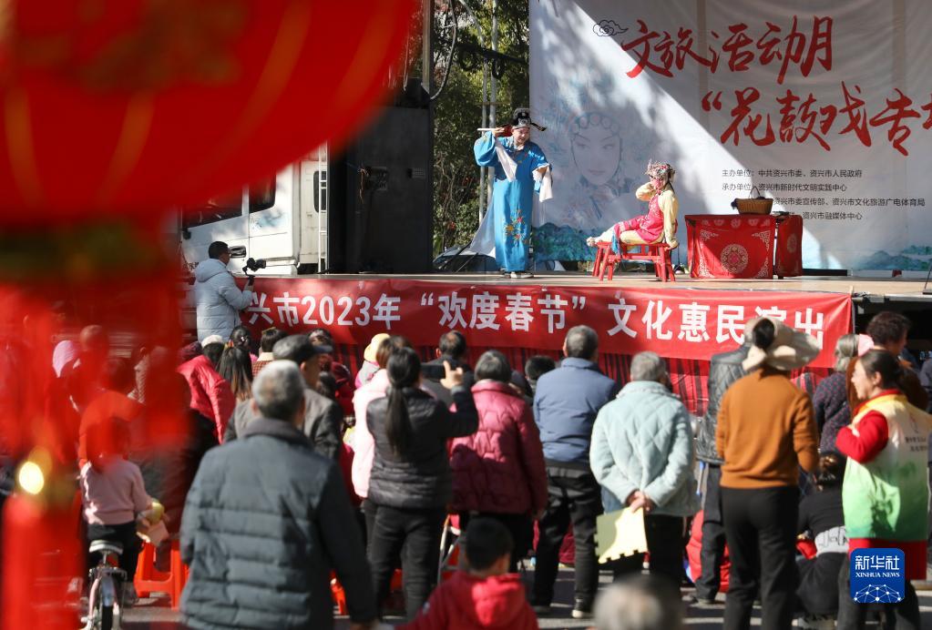 當日,湖南省資興市舉行春節花鼓戲專場演出,讓市民在家門口就能感受傳統戲曲文化的魅力,在看戲賞戲的歡樂氛圍中過大年。