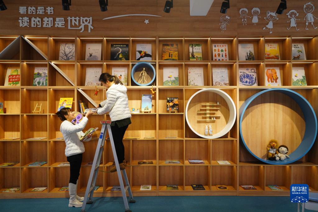1月31日,在重慶市北碚區一家幼兒園,兩名教師在整理校園讀書角。
