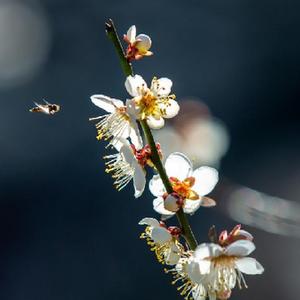 1月31日,福建武夷山景區盛開的梅花,吸引蜜蜂來采蜜。