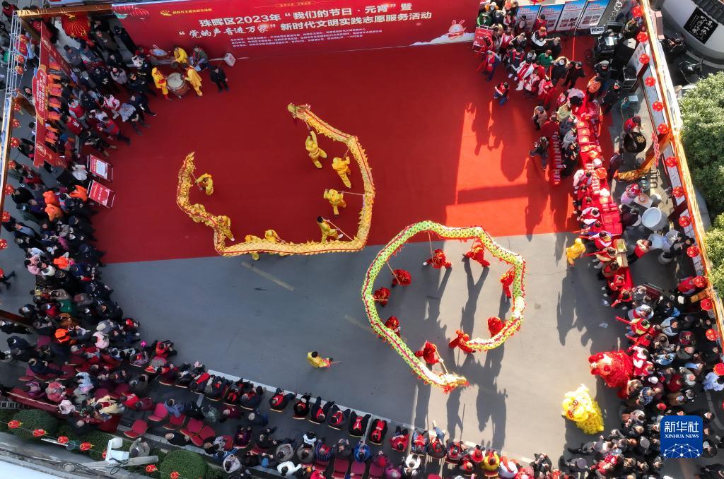 1月31日,在湖南省衡陽市珠暉區(qū)東風(fēng)街道前進里社區(qū),人們舞龍舞獅迎接元宵節(jié)的到來(無人機照片)。