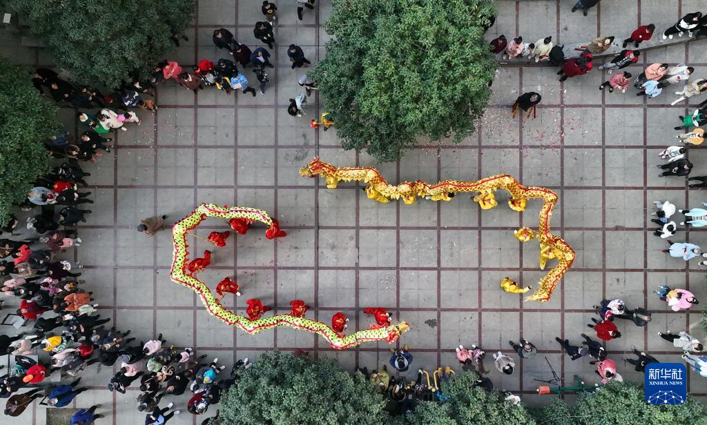1月31日,藝人在湖南省衡陽市珠暉區東風街道前進里社區表演舞龍(無人機照片)。