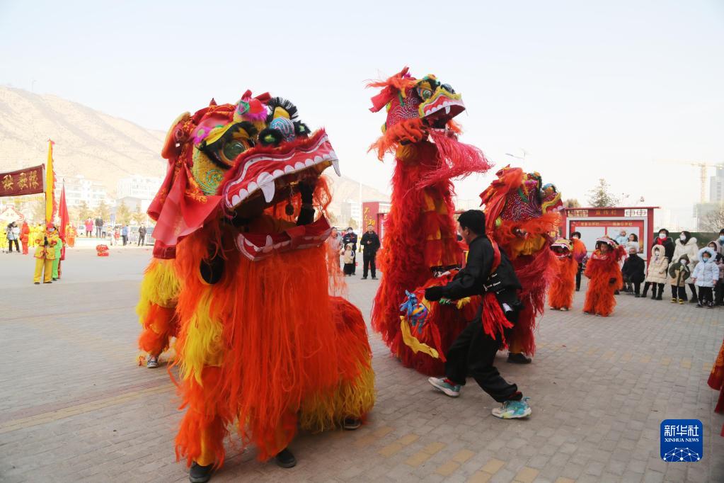 1月31日,甘肅省定西市安定區鳳翔鎮的社火隊員在表演舞獅。