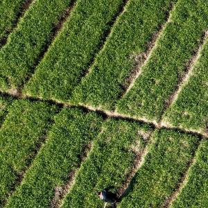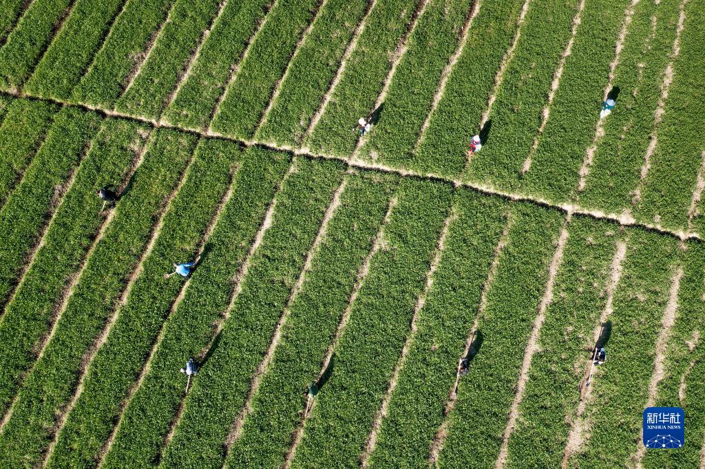 1月31日,村民在浙江省諸暨市同山鎮綠劍村的田間護理小麥(無人機照片)。