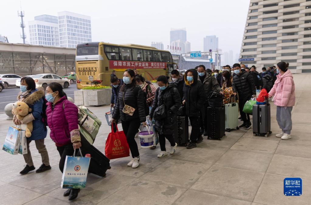 2月1日,來自四川省遂寧市的務工人員乘坐務工大巴直通車來到成都東站,準備乘坐高鐵。