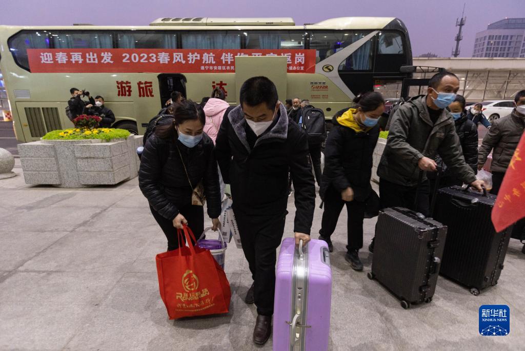 2月1日,來自四川省遂寧市的務工人員乘坐務工大巴直通車來到成都東站,準備乘坐高鐵。