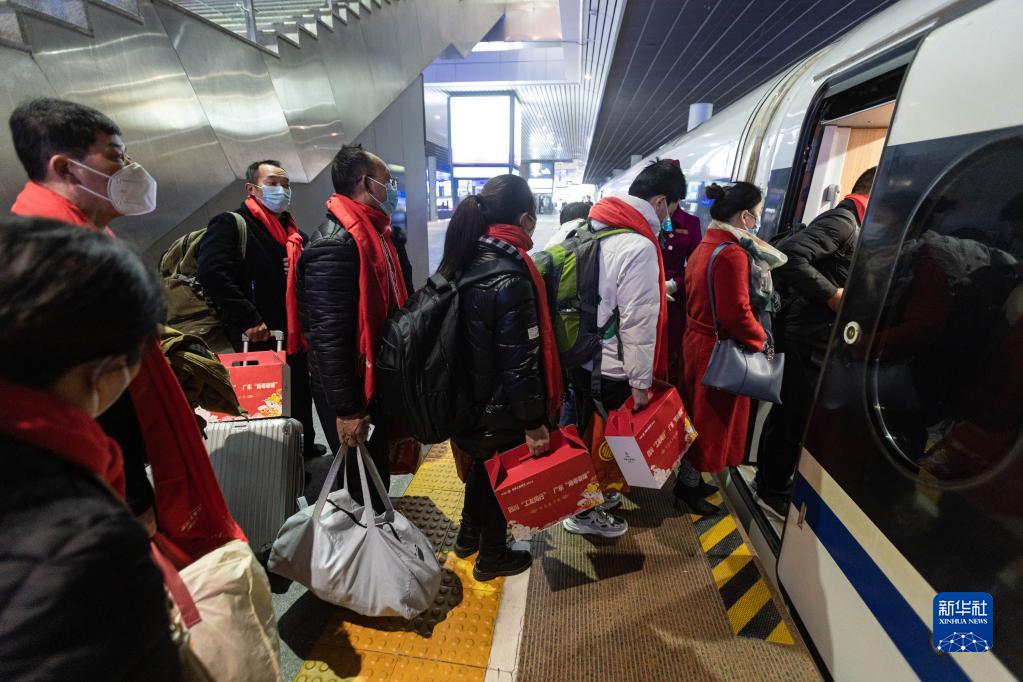 2月1日,務工人員從成都東站乘坐D1753次列車前往廣州南站,開啟務工之旅。