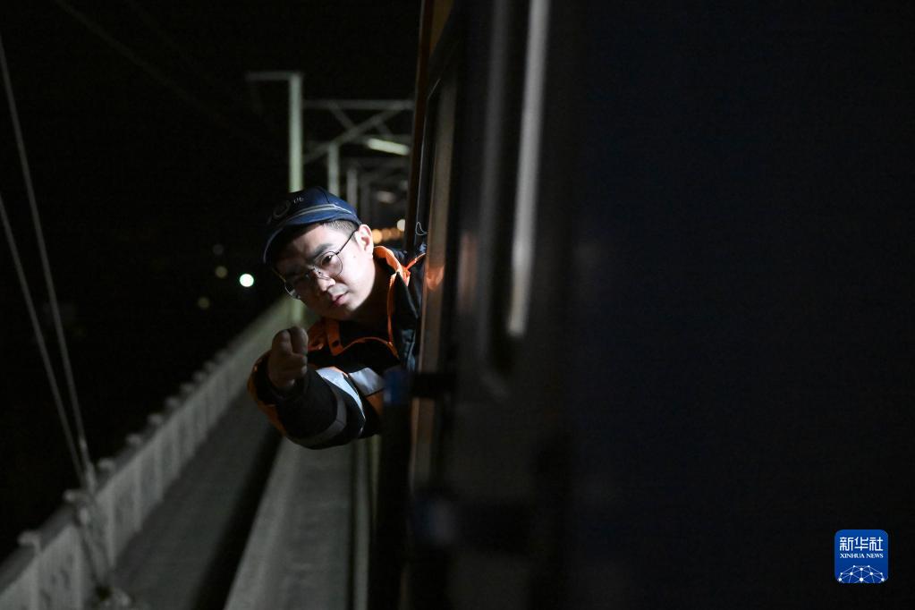2月1日凌晨,在寧安高鐵安徽銅陵段,接觸網綜合檢修列車司機在發車前瞭望。