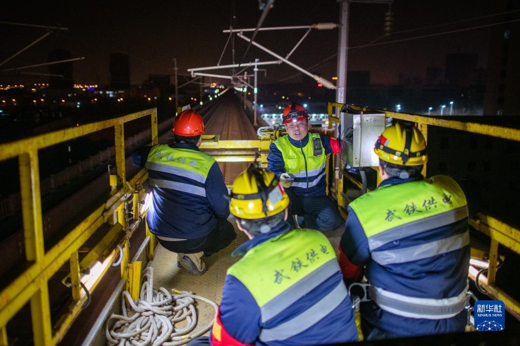 鐵路接觸網供電設備是否正常運轉,關系著每趟列車的安全運行。春運期間,中國鐵路武漢局集團有限公司武漢供電段高鐵接觸網檢修工人利用0點到6點的“天窗點”,頭戴安全帽、身穿反光服,對京廣高鐵武漢段的接觸網進行檢修、維護,為高鐵供電保駕護航。