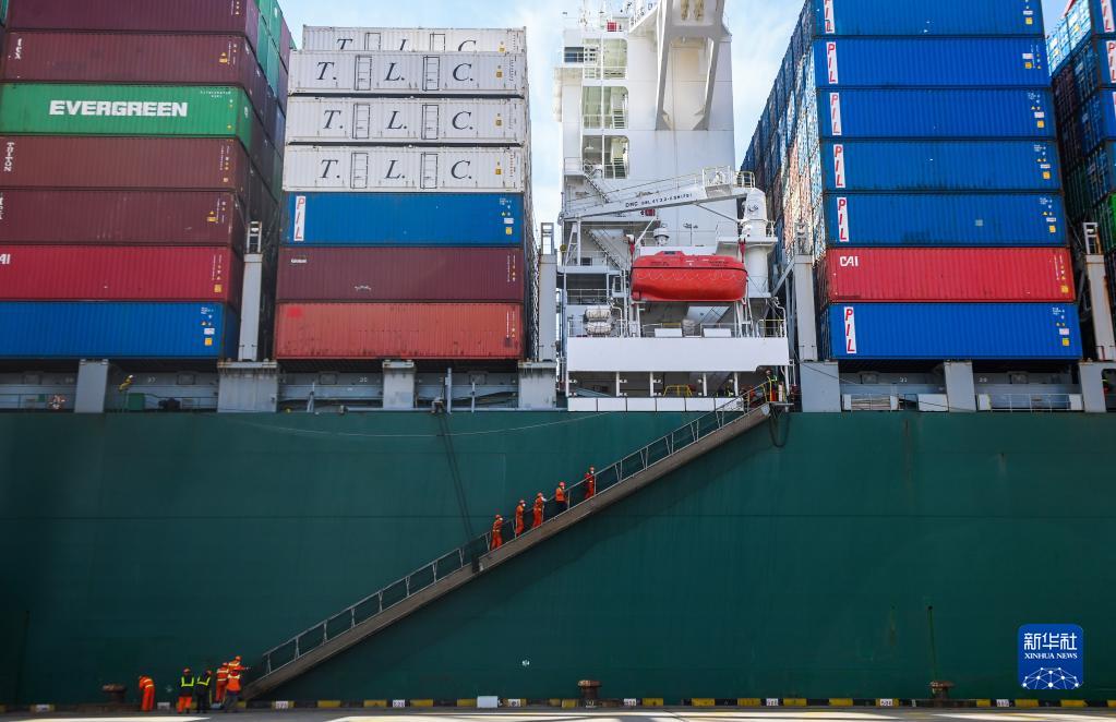 1月31日,在寧波舟山港金塘港區(qū)大浦口集裝箱碼頭,工作人員登上集裝箱貨輪協(xié)助裝卸集裝箱。