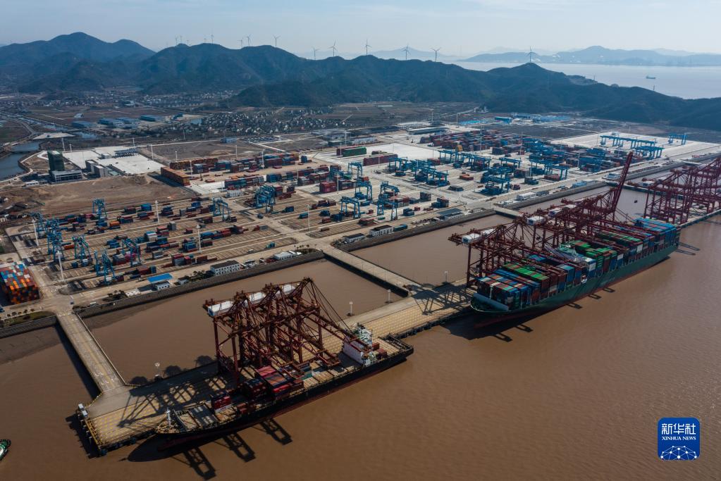 空中俯瞰位于浙江省舟山市金塘島的寧波舟山港金塘港區大浦口集裝箱碼頭(1月31日攝,無人機照片)。
