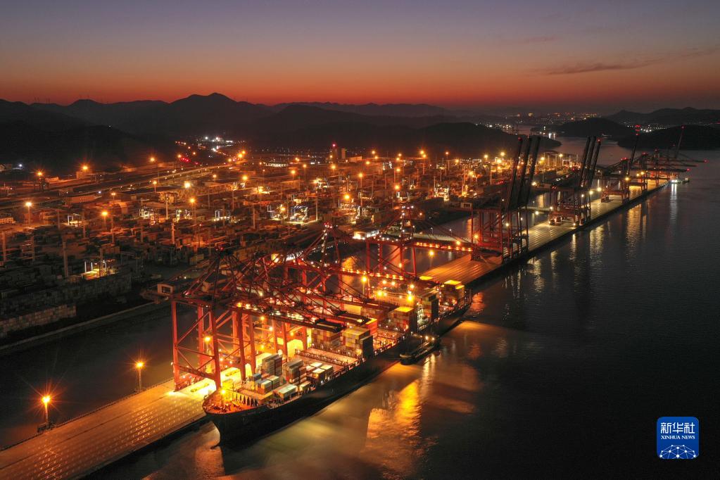 夜幕下,一艘貨輪停靠在寧波舟山港穿山港區集裝箱碼頭(1月31日攝,無人機照片)。