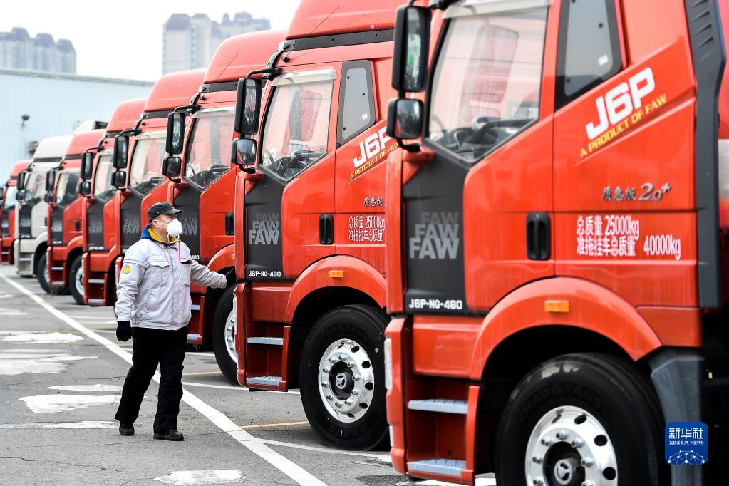 在位于吉林長春的一汽解放智慧物流公司整車物流部停車場,員工對即將轉(zhuǎn)運(yùn)交付的車輛進(jìn)行巡檢(1月31日攝)。
