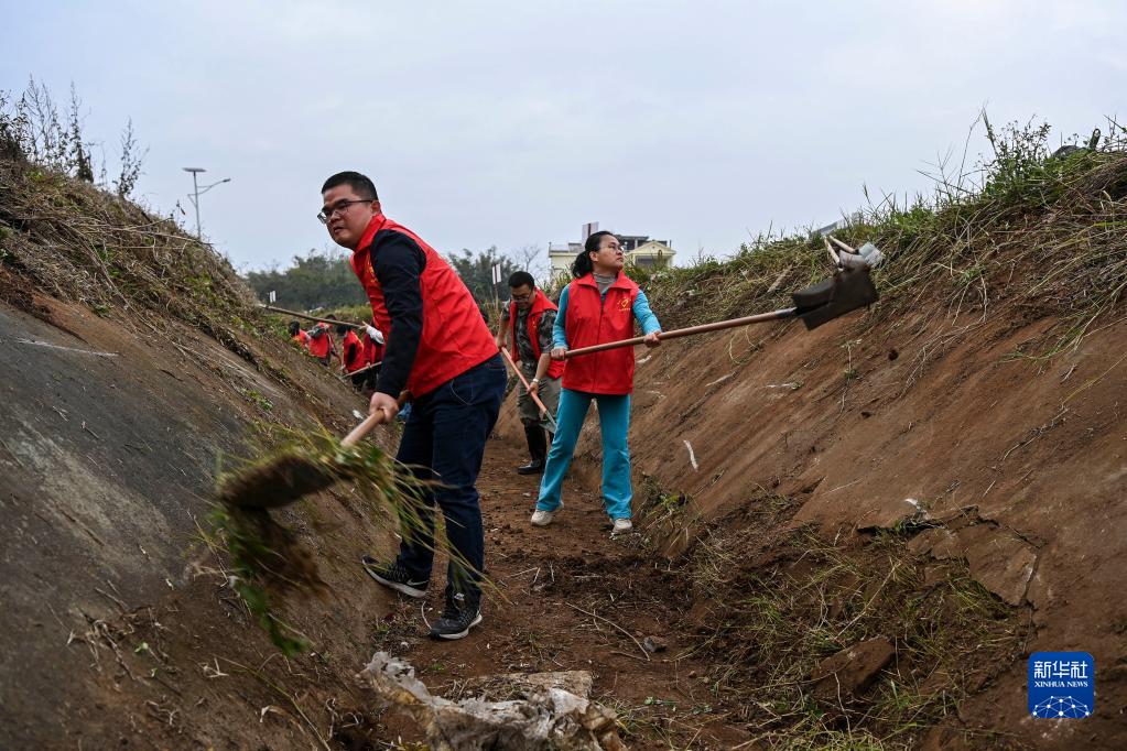2月1日,廣西興業(yè)縣沙塘鎮(zhèn)的黨員干部群眾一起清理灌渠內(nèi)的雜物。