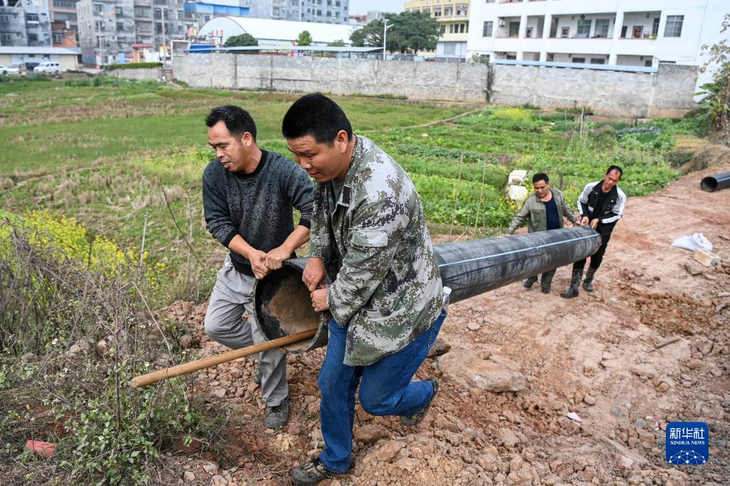 2月1日,廣西興業(yè)縣沙塘鎮(zhèn)的黨員干部群眾一起搬運(yùn)輸水管道。