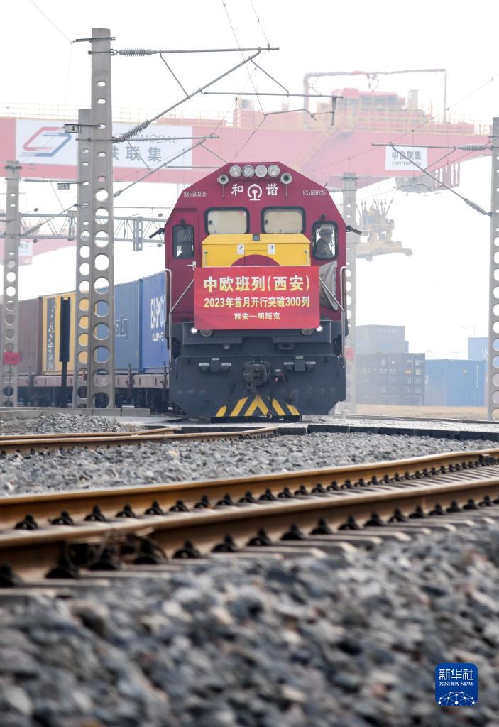 當日,滿載日用百貨的X8151次中歐班列從西安國際港站駛出,開往白俄羅斯首都明斯克。2023年1月,陜西中歐班列開行突破300列,達到346列,創歷史同期最好成績,取得新年開門紅。