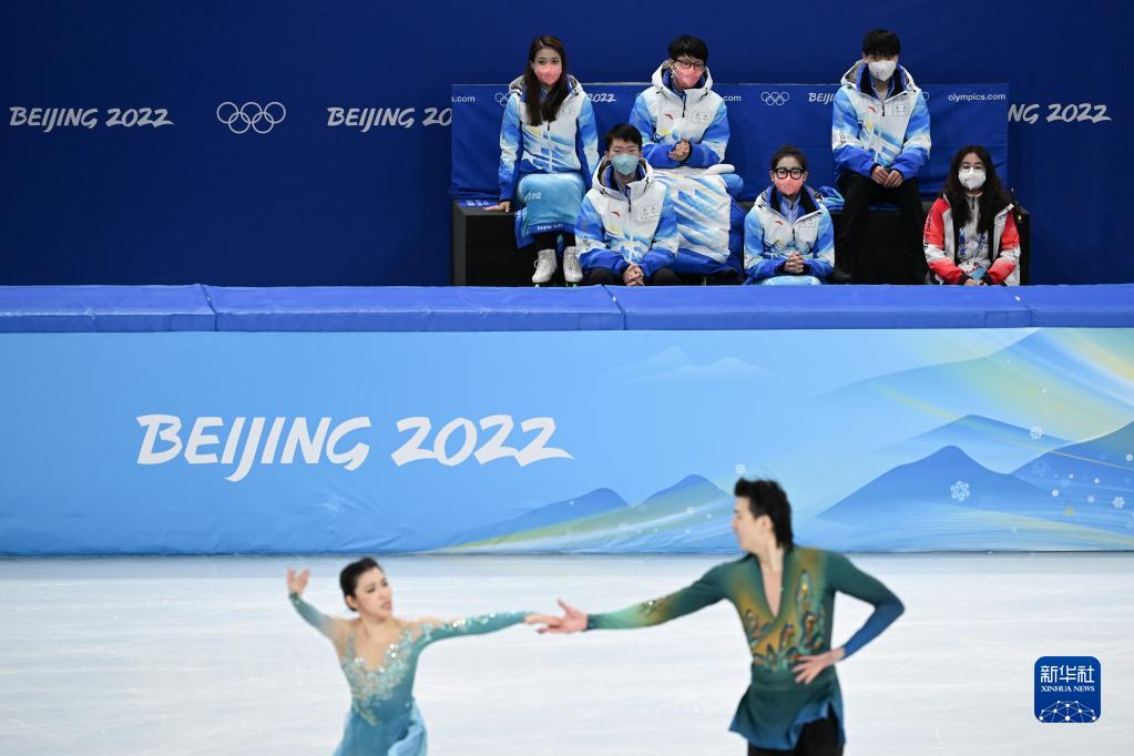 在北京冬奧會花樣滑冰冰舞自由舞比賽時,楊曦(上 左二)和其他志愿者在場邊等候(2022年2月14日攝)。