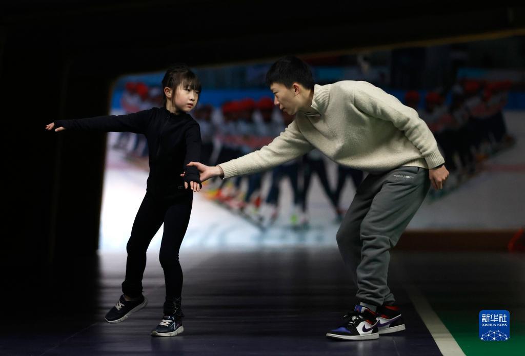 楊曦(右)在陸地訓練課上為8歲的小學員鄭詩琪指導花樣滑冰技術動作(1月15日攝)。