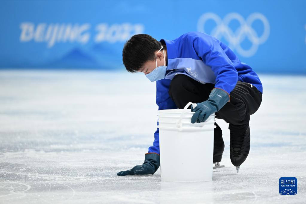 在北京冬奧會花樣滑冰男子單人滑自由滑比賽結(jié)束后,楊曦進行冰面修補(2022年2月10日攝)。