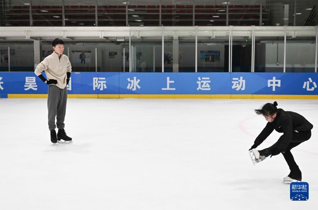 楊曦(左)在冰上訓(xùn)練中為8歲的小學(xué)員鄭詩(shī)琪指導(dǎo)花樣滑冰技術(shù)動(dòng)作(1月15日攝)。