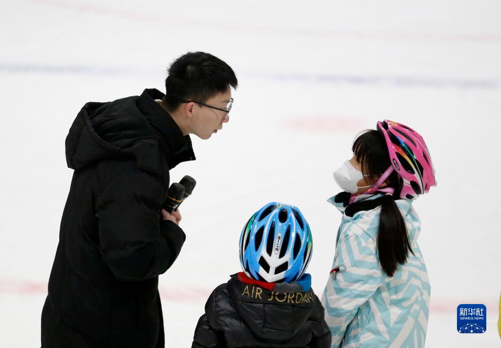 楊曦(左)在滑冰基礎(chǔ)教學(xué)課上聆聽(tīng)兩名小朋友提出的問(wèn)題(1月17日)。