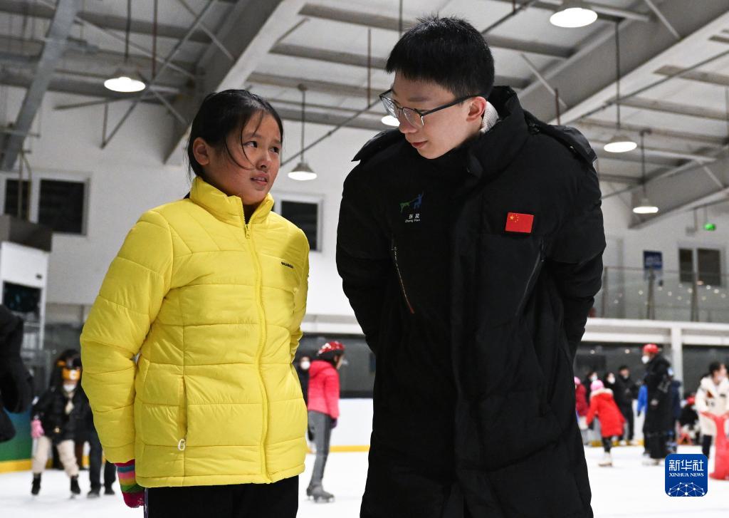 楊曦(右)在滑冰基礎教學課上與一名女孩交流(1月7日攝)。