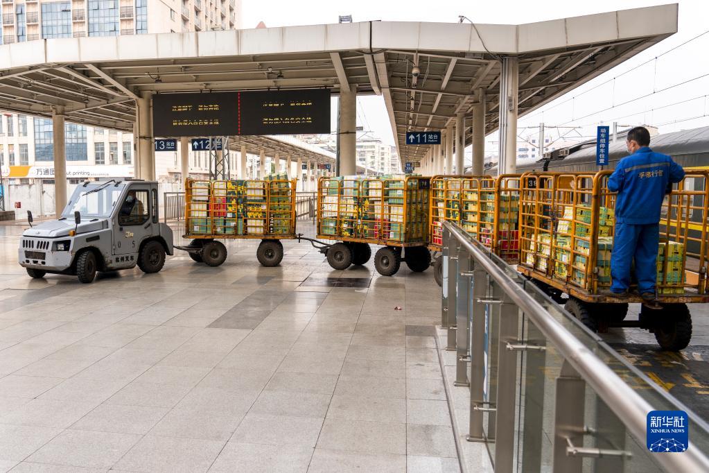在南昌火車站站臺,張細茂駕駛牽引車運送行李包裹(2月1日攝)。
