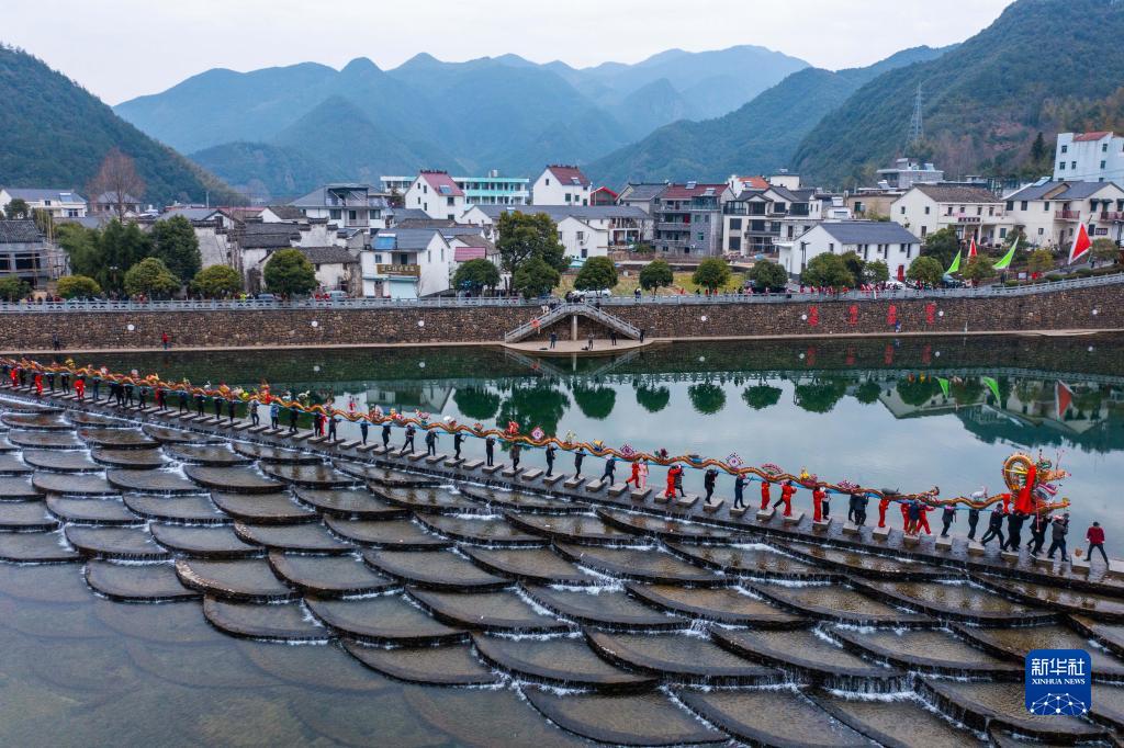 2月1日,窈口村女子板龍隊(duì)在湖源鄉(xiāng)的龍鱗壩碇步橋上進(jìn)行舞龍表演(無(wú)人機(jī)照片)。