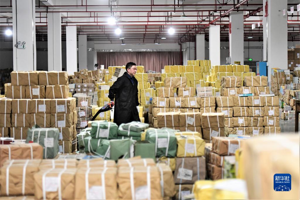 1月31日,在湖南省郴州市萬(wàn)信達(dá)工業(yè)園新華書(shū)店倉(cāng)儲(chǔ)中心,工作人員在搬運(yùn)教材。
