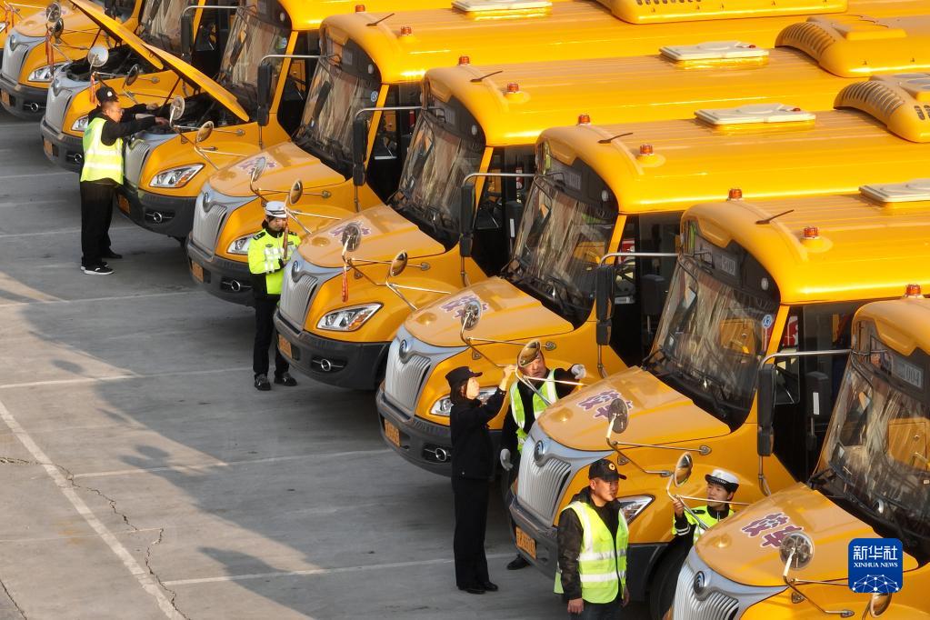 2月1日,江蘇省揚州市寶應縣公安局的交警對轄區校車進行檢查(無人機照片)。