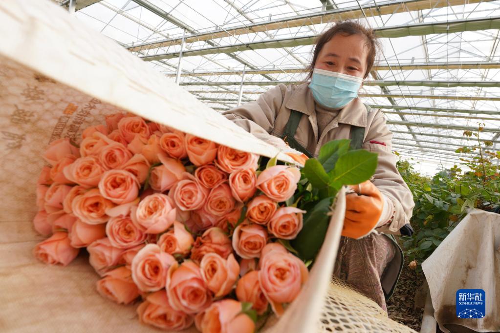 2月1日,村民在河北邱縣盛水灣玫瑰產業園打包采收的玫瑰花。