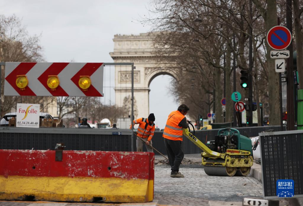 2月1日,工人在法國(guó)巴黎凱旋門附近修路。