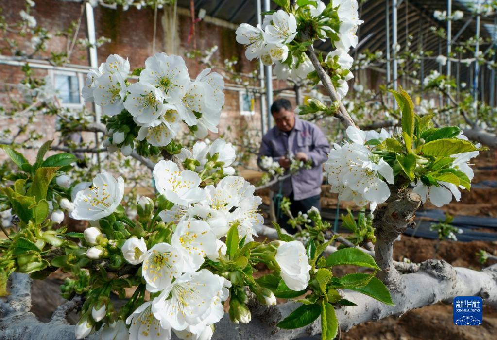 2月1日,秦皇島市撫寧區榆關鎮一家櫻桃種植合作社的社員在大棚內管護櫻桃樹。
