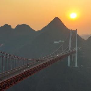 當日,貴州壩陵河大橋沐浴在夕陽余暉下,美不勝收。