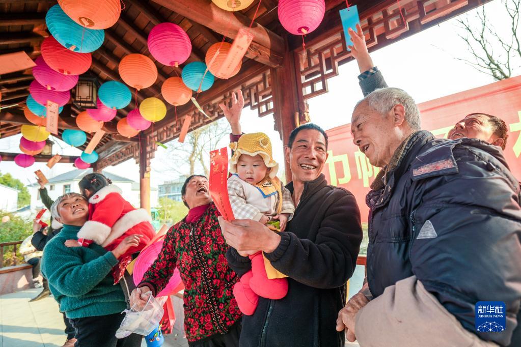 2月2日,村民在浙江省湖州市長興縣煤山鎮仰峰村文化禮堂外賞花燈、猜燈謎。