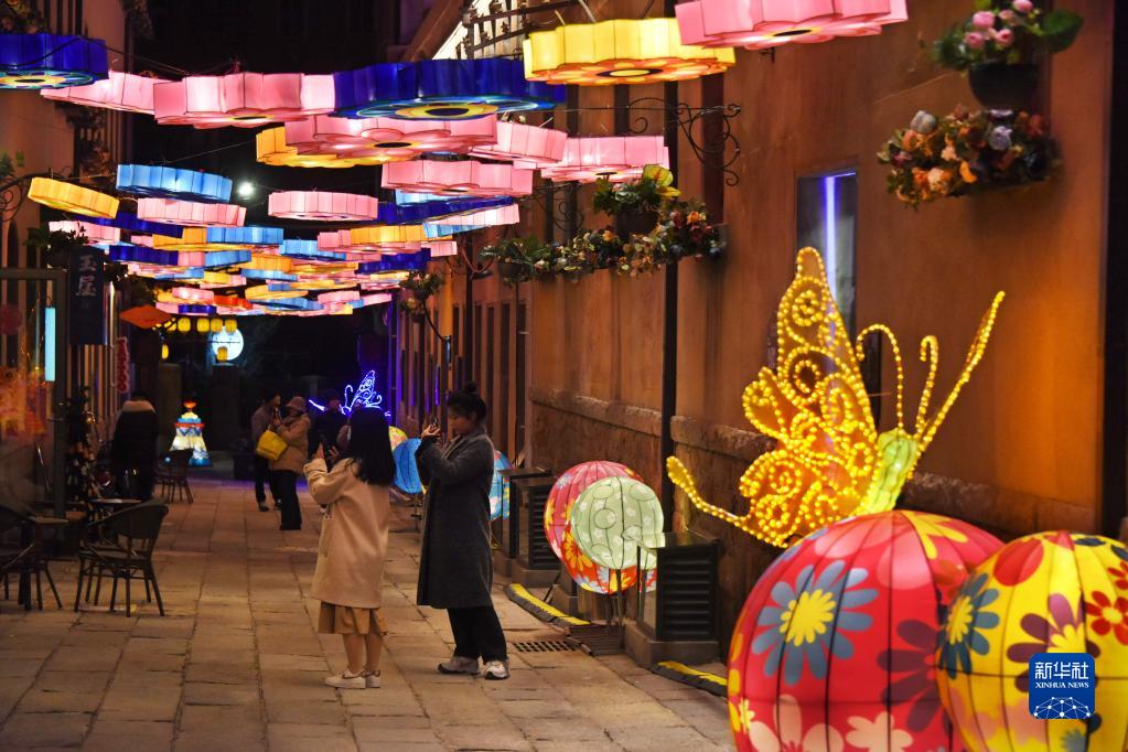 元宵節臨近,青島市市南區“逛街里”新春燈會上的璀璨花燈點亮了老城區的大街小巷,吸引人們前來賞燈。