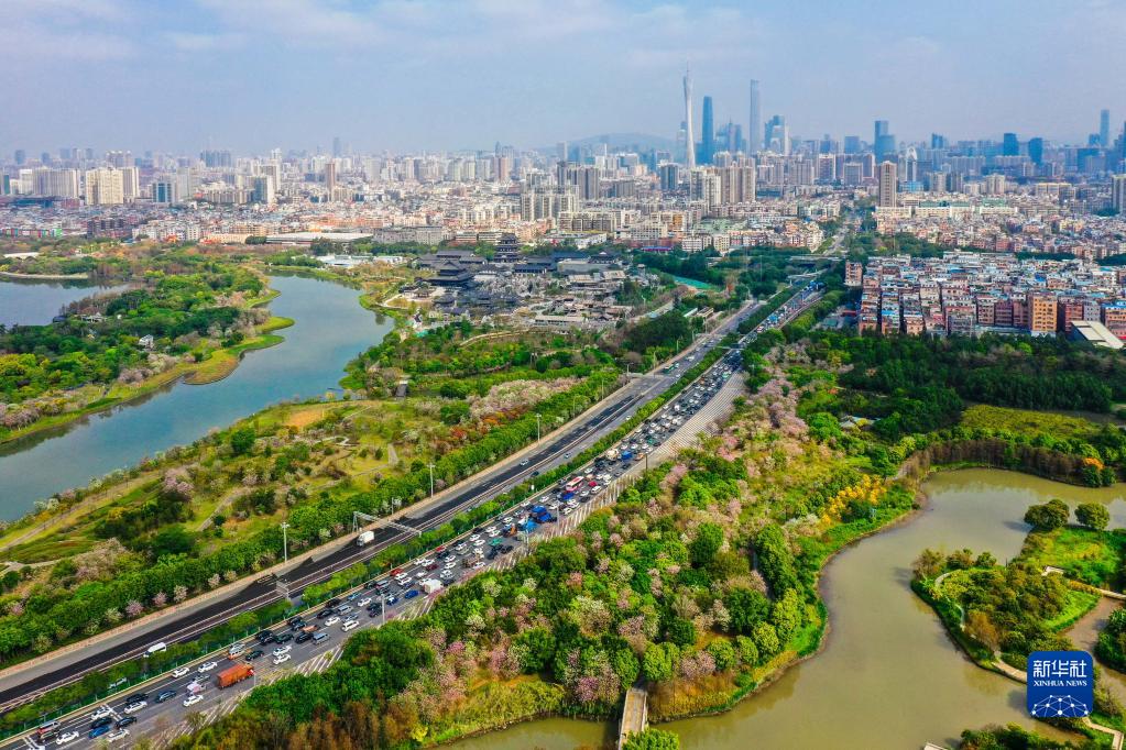 廣州海珠濕地宮粉紫荊綻放(2022年3月11日攝,無人機照片)。