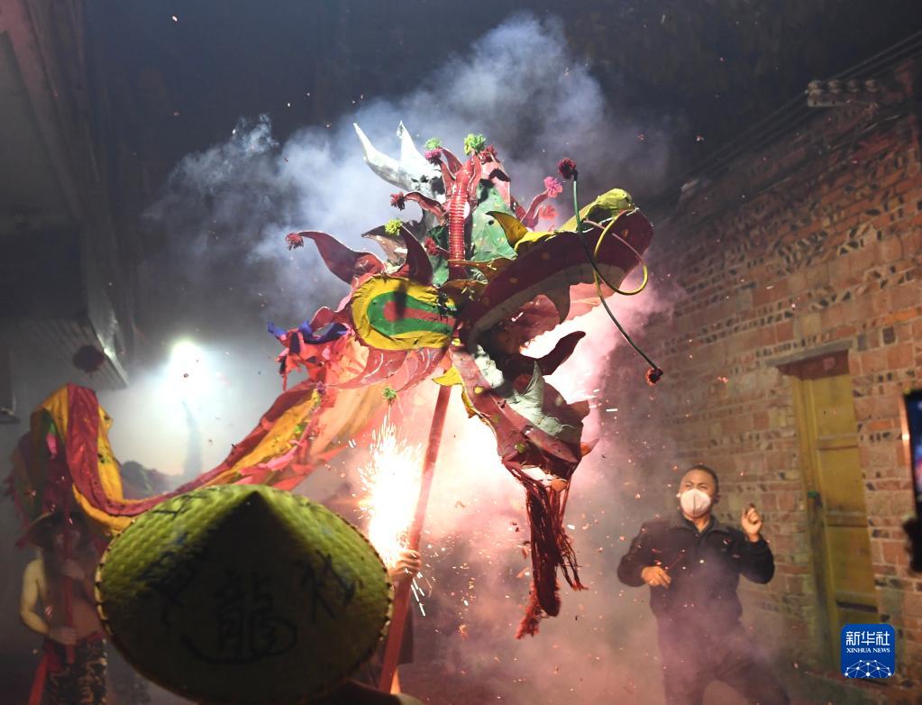 人們在廣西南寧市賓陽縣縣城舞炮龍(2月1日攝)。
