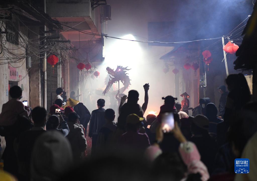 人們?cè)趶V西南寧市賓陽(yáng)縣縣城舞炮龍(2月1日攝)。
