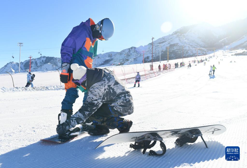 在新疆白云國際滑雪場,把爾斯·木拉提(右)教學員單板滑雪技巧(1月26日攝)。
