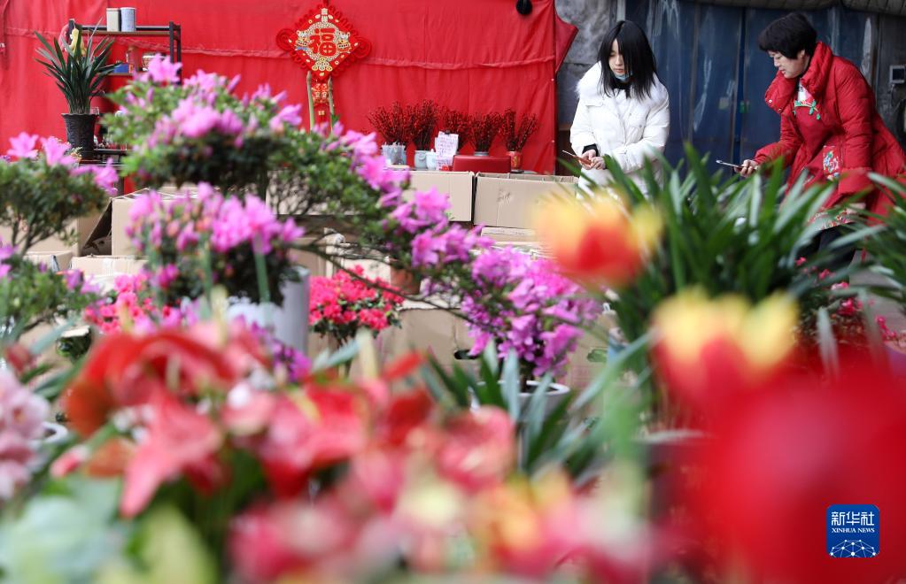 2月1日,沈陽市十里河街道花卉基地的花農在大棚內進行線上直播銷售。