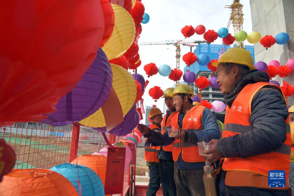 2月2日,施工人員在山東濟南國際金融城北區項目現場猜燈謎。
