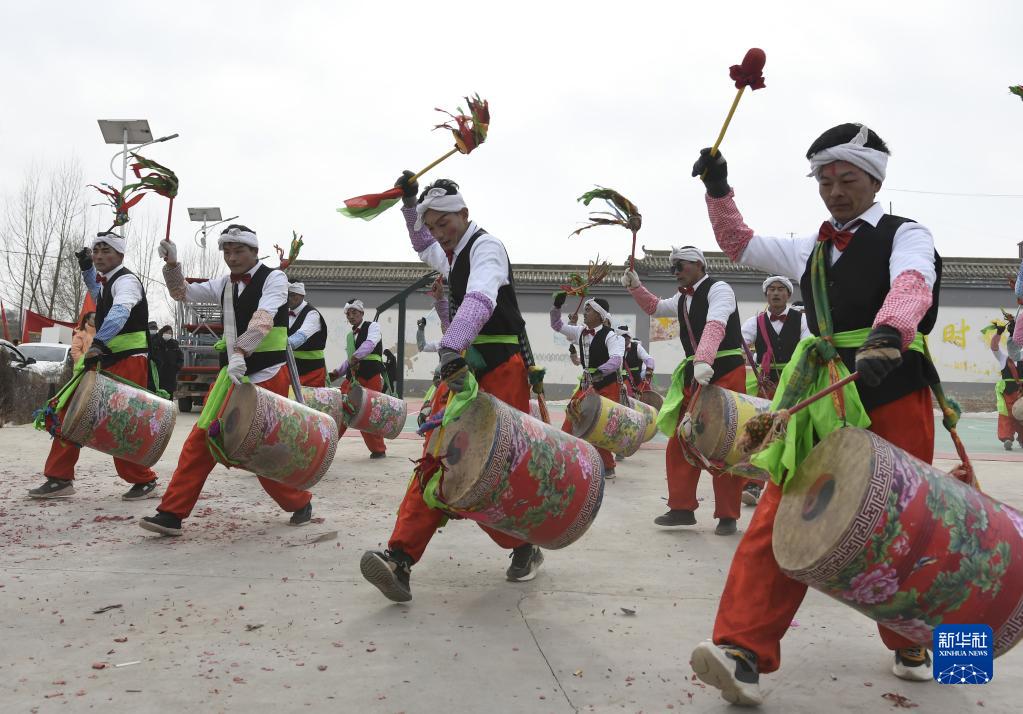 2月1日,鄉村秧歌隊在甘肅省臨夏回族自治州積石山保安族東鄉族撒拉族自治縣表演秧歌節目“太平鼓”。