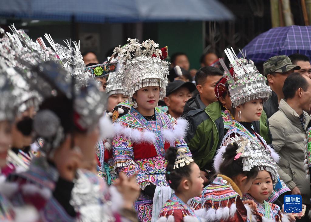 2月2日,融水苗族自治縣桿洞鄉苗族姑娘在觀看民俗表演。