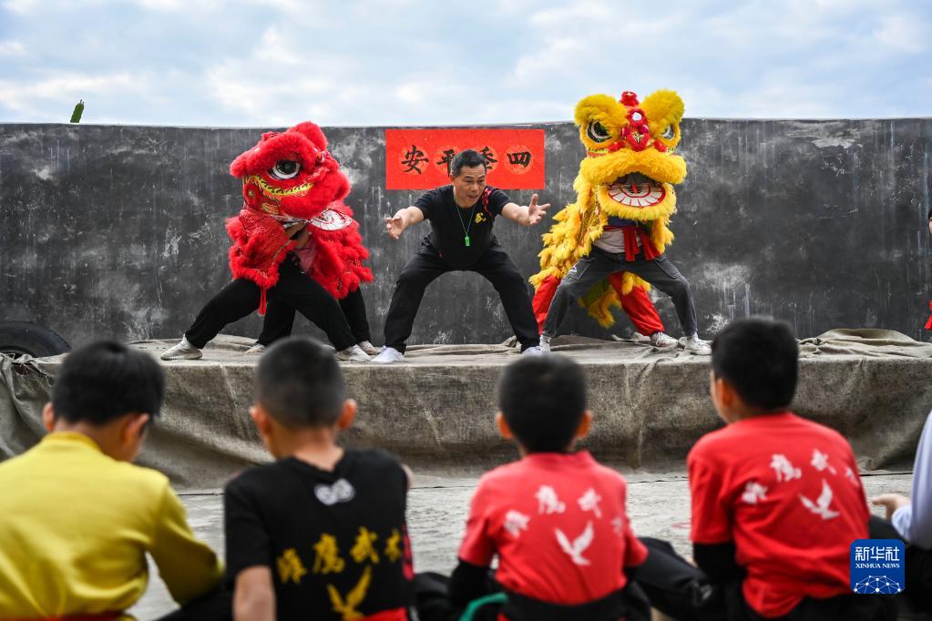 2月2日,在廣西興業縣石南鎮東周村,教練在傳授舞獅的基本功。
