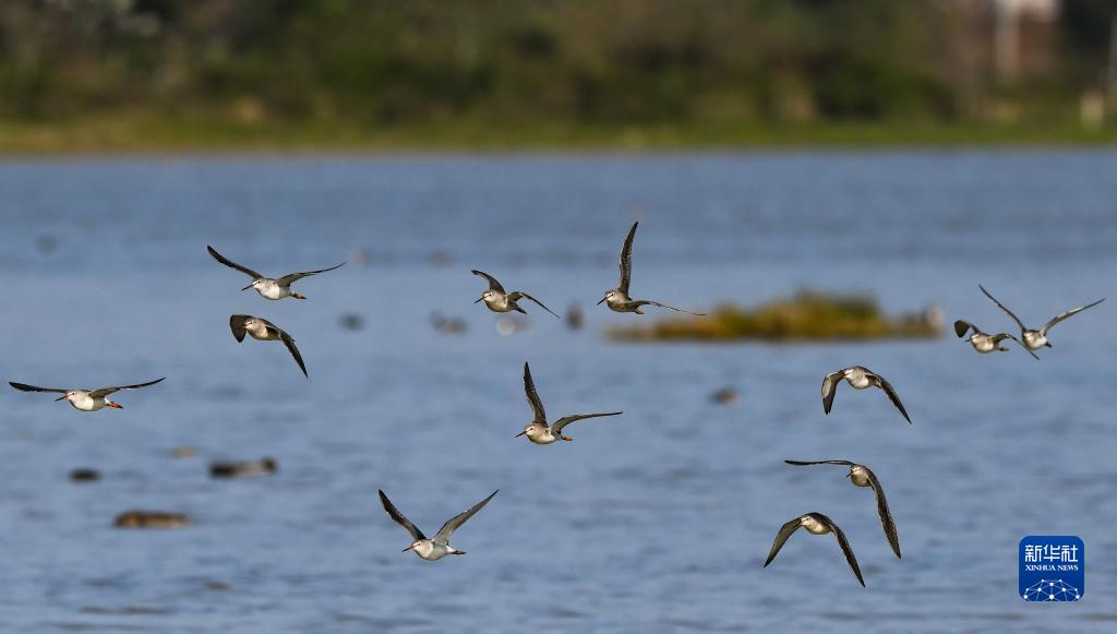 一群鶴鷸在海南東寨港國家級自然保護區內飛翔(1月30日攝)。