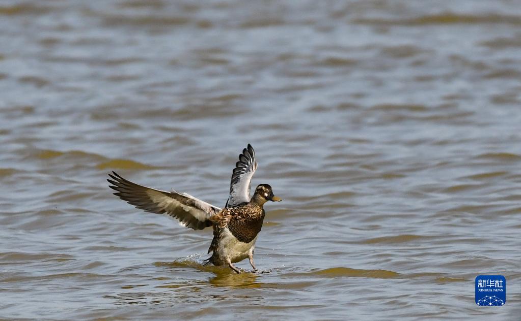 一只白眉鴨飛落在海南東寨港國家級自然保護區內的水面上(1月30日攝)。