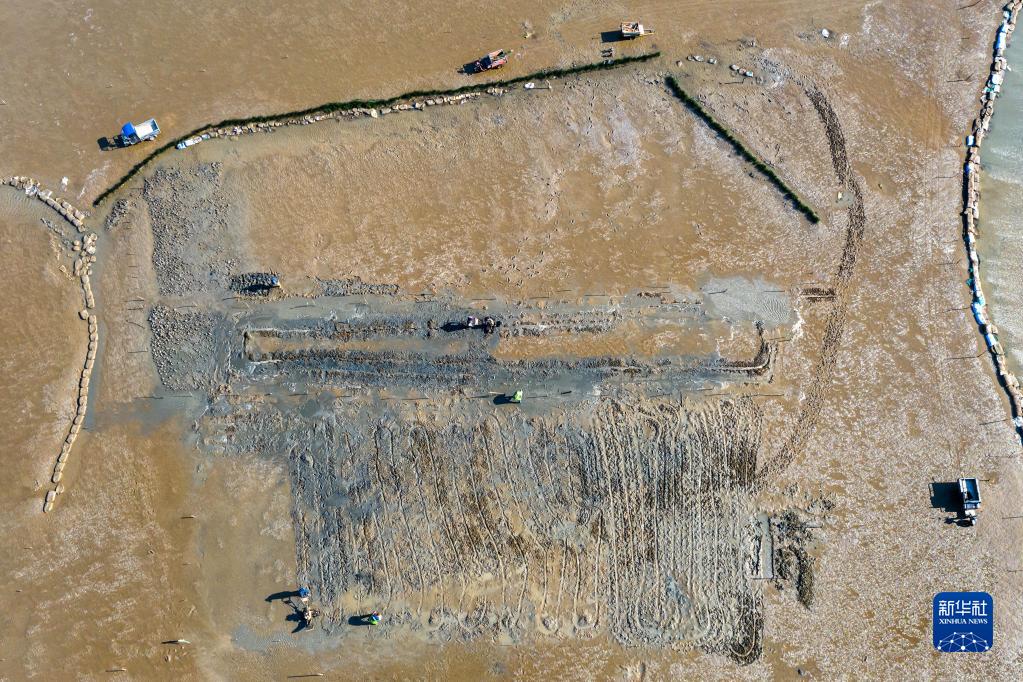 2月2日,福州瑯岐島漁民在翻耕灘涂播種蟶苗(無人機照片)。