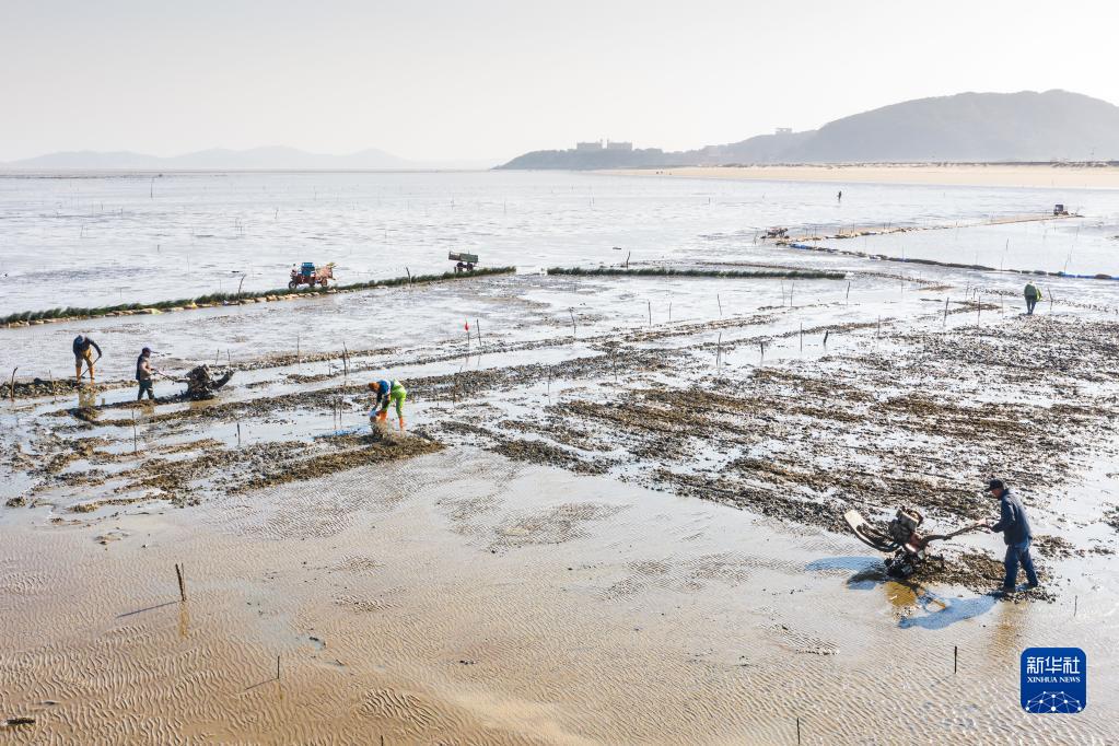 2月2日,福州瑯岐島漁民在翻耕灘涂播種蟶苗(無人機照片)。