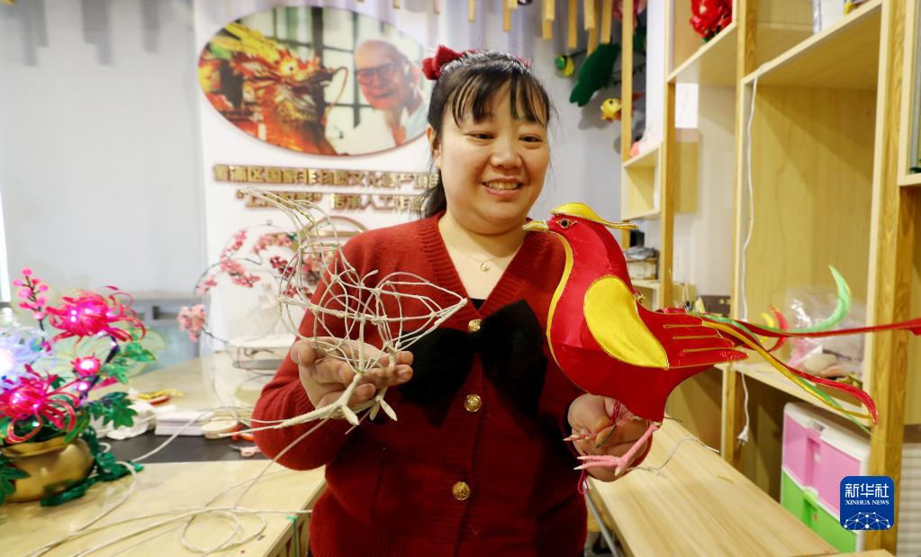 2月1日,龔智瑜展示鳥類燈彩的骨架和裱糊成品。